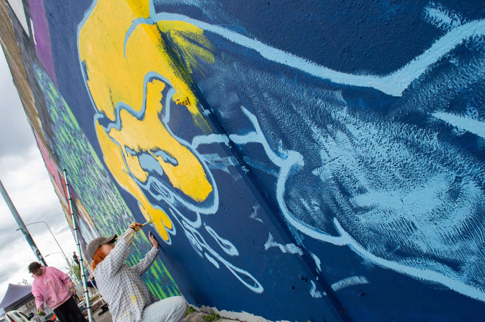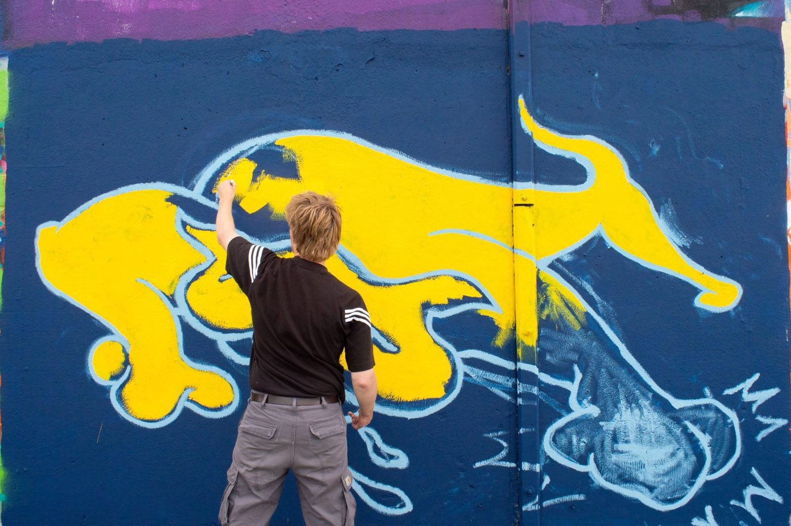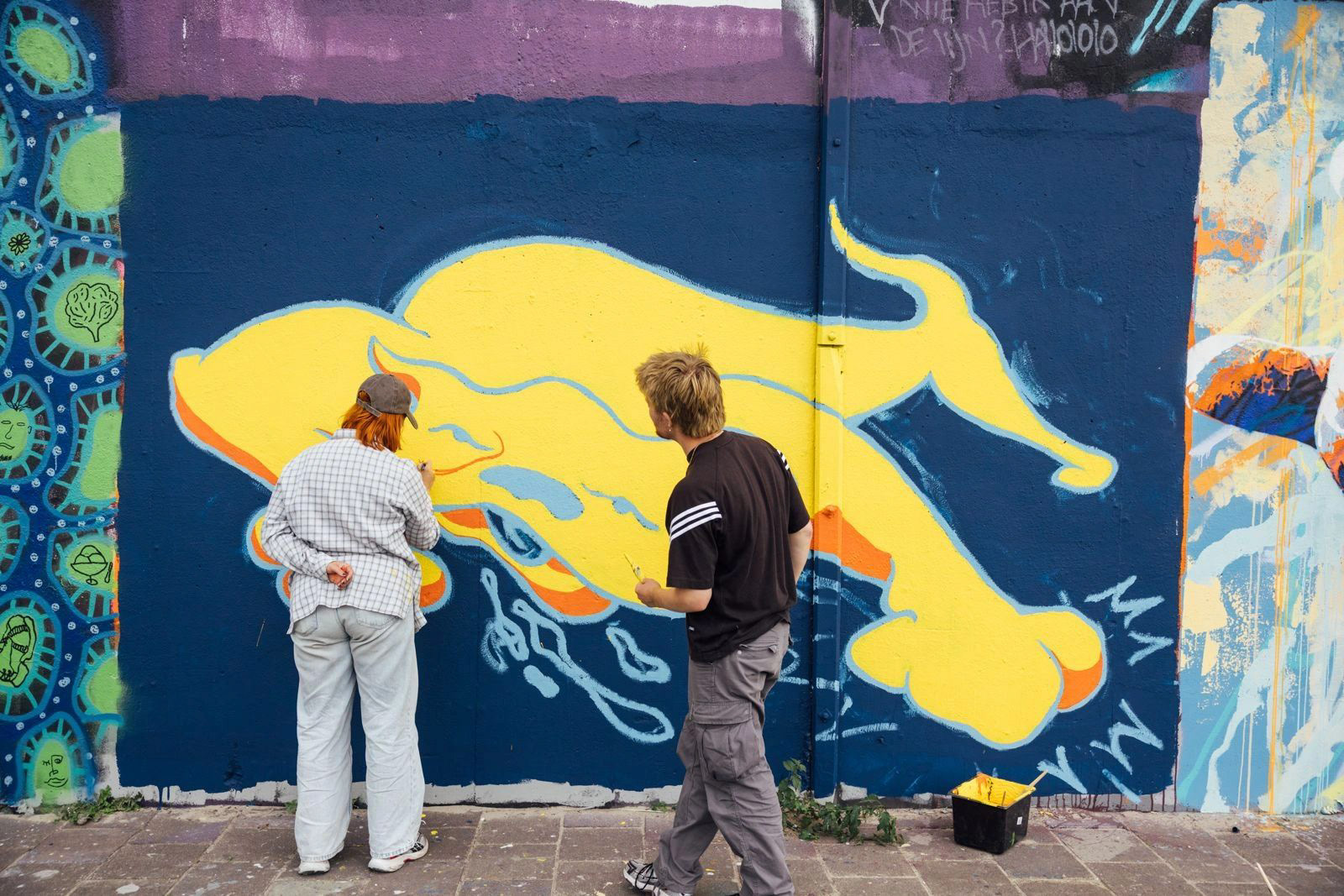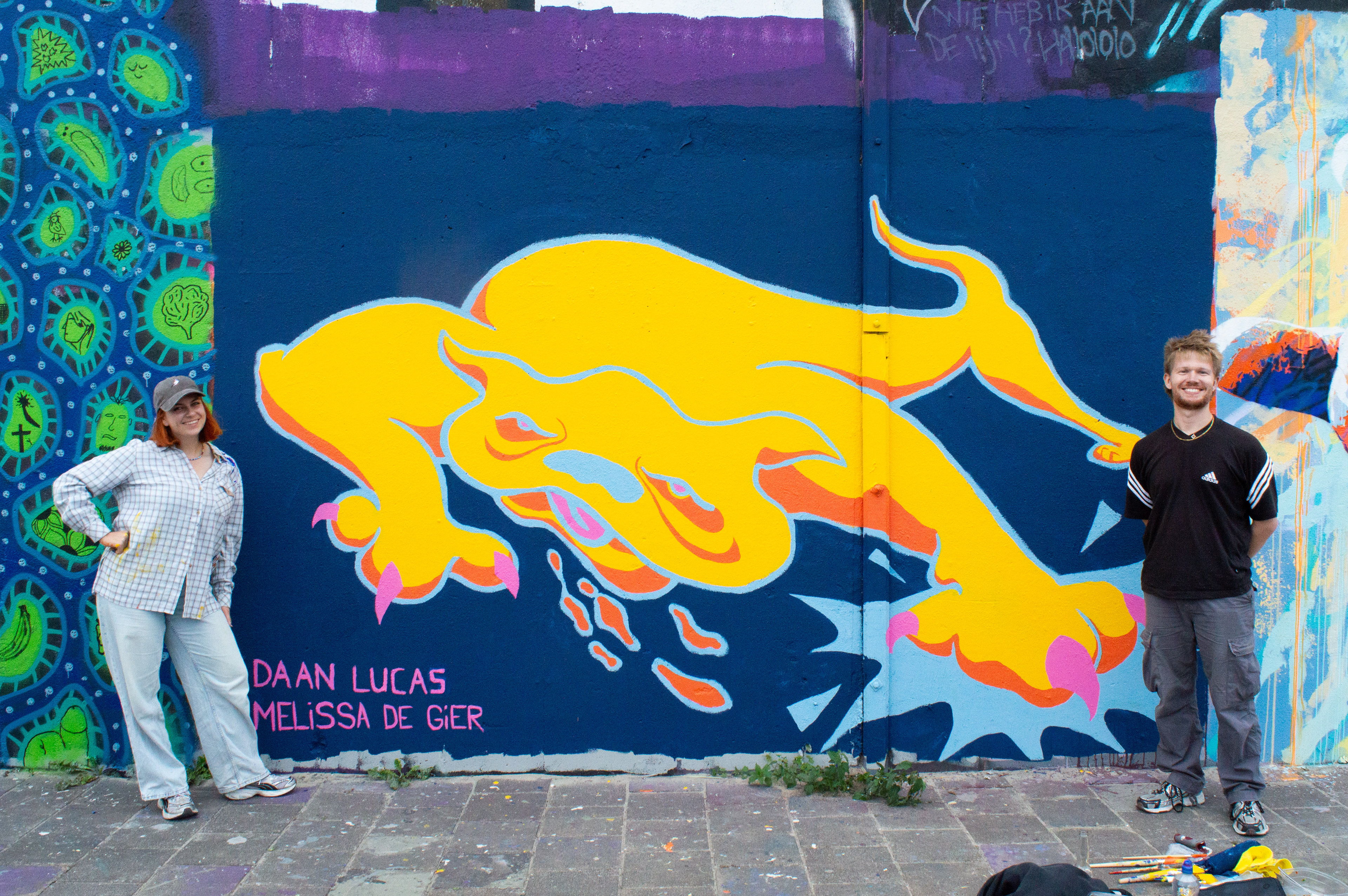 On the 22nd of August 2025, thanks to @blindwallsgallery, I got the chance during Talent Day to dive into making my very first mural. Illustrator Melissa de Gier and I decided to work together on this piece to get the best results. From a tiny sketch, the image grew into a 3.5 by 2.5 meter piece: a sexy, wild, stomping, slimy yellow dog. Enjoy!
